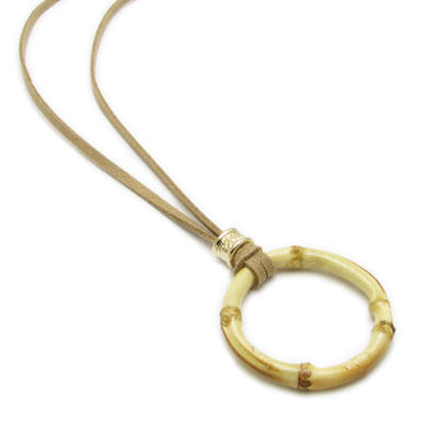 【メール便 送料無料】 本物の竹素材をサークル状に加工したトップが美しい ロングレザーネックレス 天然素材ならではの優しい風合いと素朴な味わいが魅力的です トップ部分にサングラスを引っ掛けて サングラスホルダーとしてもご利用いただけます 素材:竹、合金、スエード風合成皮革紐 トップ大きさ:大=直径約55mm/小=直径約40mm 重さ:大=約5g/小=約3g 紐長さ:約80cm ※ペンダントトップは天然素材の為、 サイズや色目、柄はすべて個体差があります ご了承ください