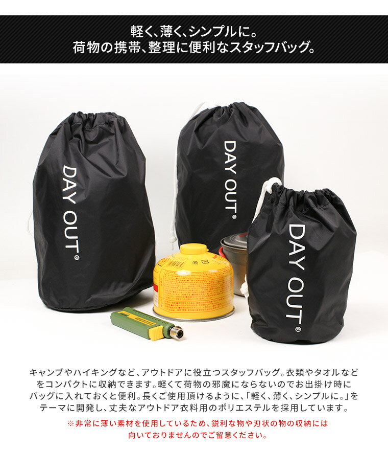荷物の整理がしやすく、目的別に収納可能 衣類やタオルなどをコンパクトに収納できる巾着タイプのスタッフバッグです。